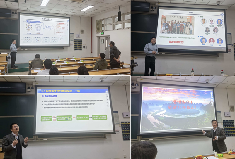 张伟雄教授现任中山大学教授、博士生导师,化学学院副院长,主持承担面上项目、优青项目、联合基金重点项目等多项国家自然科学基金项目,现兼任含能材料全国重点实验室学术委员、中国化学会第31届理事会青年委员、广东省化学会第9届委员会常任理事。他围绕多离子集成含能材料的设计理念、构筑方法、性能及应用等问题,系统介绍了其团队在离子型杂化材料与含能材料领域的代表性成果。张教授重点阐述了如何通过阴离子导向组装实现新型含能材料的创新设计,并展示了创制的无需硝化、易于放大生产、兼具军民应用潜力的多离子集成含能材料体系。报告还介绍了其团队构建的从基础研究到应用转化的全链条单质炸药创新体系的相关进展,其中典型化合物已实现吨级量产,其关键技术在关键领域已完成工程化应用。他的报告充分体现了基础研究与工程转化紧密衔接的鲜明特色,也为在场师生理解功能材料从实验室研究走向实际应用提供了重要启发。
